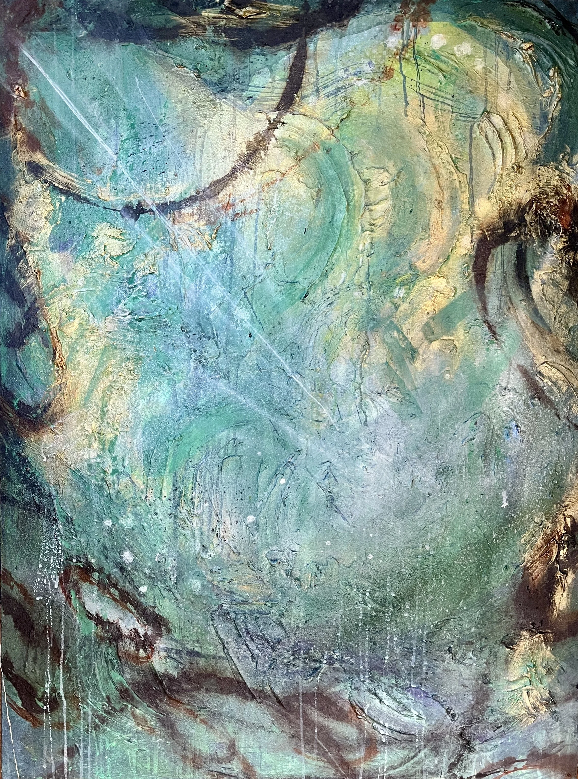 Layered with plaster, spray paint, acrylic, oil pastels, and watercolor, Clove moves in deep greens and rich golds, with traces of shadow and light weaving across its surface. The textures carry both weight and fluidity, evoking the grounding presence of earth with a subtle shimmer of the unseen.